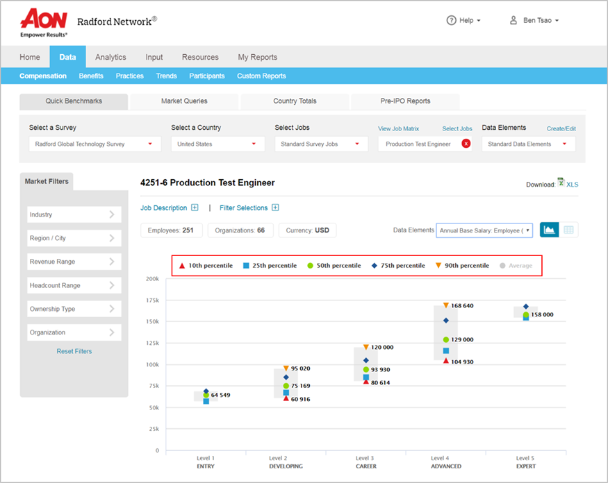 - In the Quick Benchmarks tool, the "chart-view" now gives the ability to toggle on the average of the data. By default, the average is toggled off; however these percentile and average "dots" on the chart can be toggled on or off by clicking on the specific percentile or average you want to have or not have displayed.